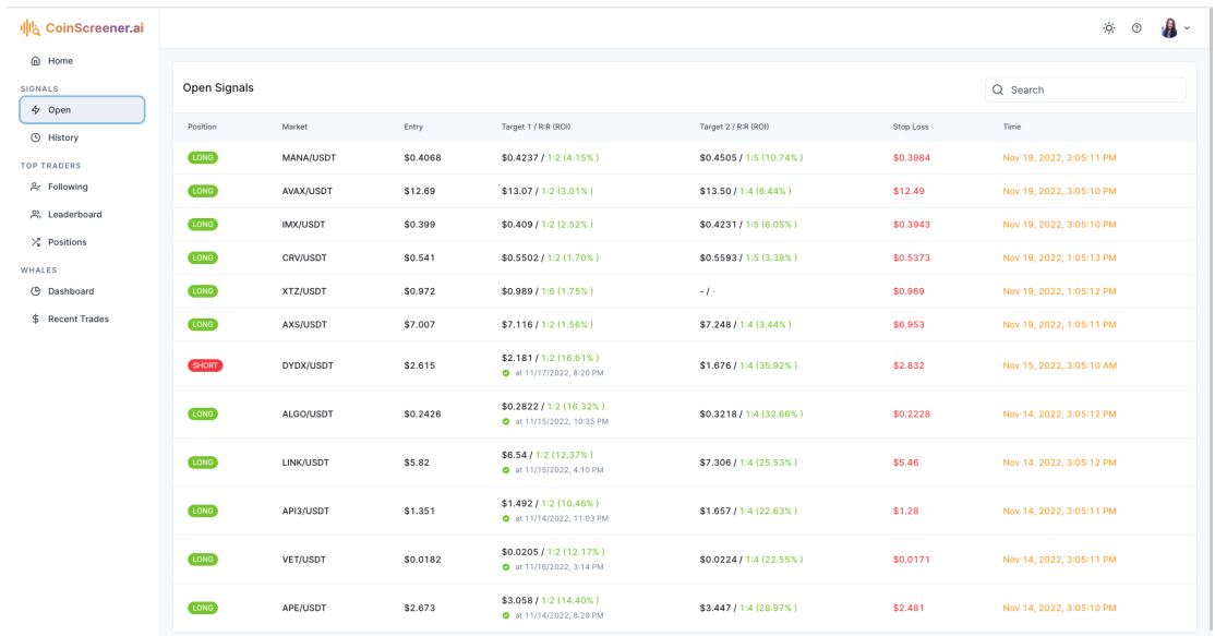 4. Check open signals provided on CoinScreener.ai and choose a signal you want to follow.