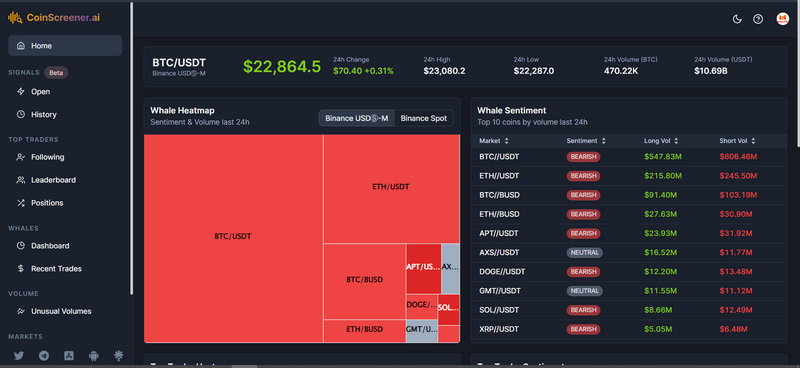 Visit CoinScreener with a proprietary algorithm, rich data source from more than 1000 Future & Spot markets enriched by Machine Learning, and major cryptocurrency exchanges in the world to screen for market trading signals, monitor and analyze the trading behavior of Whales, Top Traders to identify the best market trends in real-time and make the most profit from your trade today.