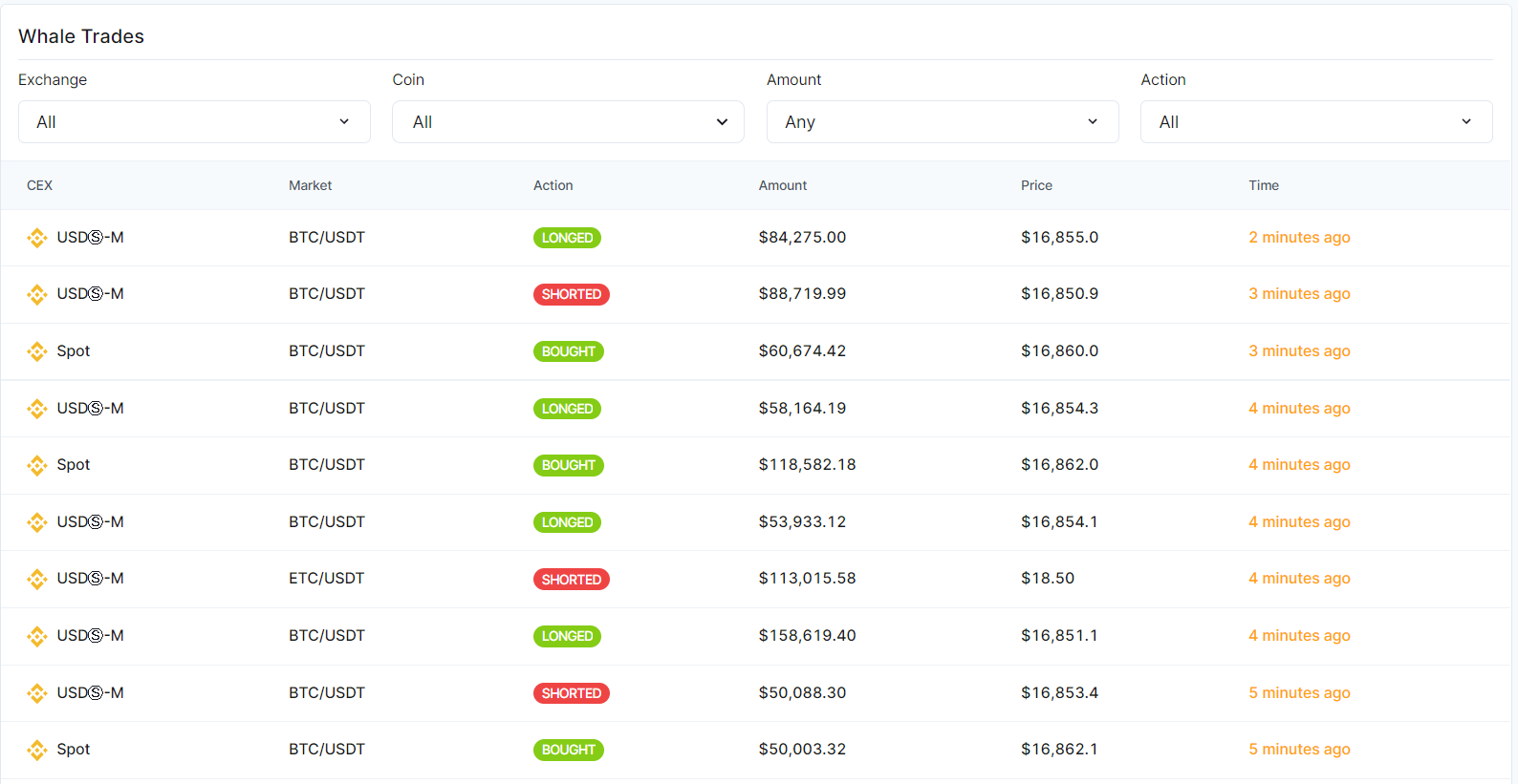 Keep an eye on the market and never miss an opportunity. You will get alerted of large buys/sells and track the history of whale activities for 1000+ Future & Spot markets with CoinScreener.